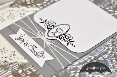 I created all the invitations using gray and white cardstock. I designed the top white panel shape in my SCAL 4 software to fit the gorgeous border stamp in the First Communion stamp set. I stamped using VersaFine Onyx Black ink and used clear embossing powder on the outline. The sentiment was also stamped in the same way. For the chalice, I used the same ink, but embossed with white pearl embossing powder for a silver look.I used the dotted border stamp with gray ink to add a little more visual interest to the paper underneath the sentiment banner. All the white cardstock was popped up with foam tape. I used Totally White Trendy Twine to embellish and also added a dot of Ice White Viva Pearl Pen above the chalice to look like the Holy Eucharist. Here is a look at all the invitations I created!