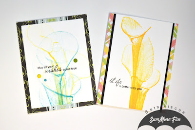 The best part is that you can re-use your string! Above you can see the second use of the string (without reinking) next to the first. Below, the first card shows the third use of the blue reinker, which is quite faint, but I added the third use of the yellow with it for more visual interest. The card on the right was the second use of the yellow string.