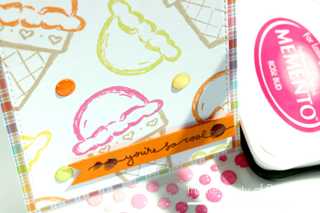 You can stack the ice creams on top of each other, too. Super cute. For this card, I first stamped the ice cream on scrap paper and cut out for masking. I randomly stamped the ice creams in pink, orange, green, and yellow masking them and then stamping the cone. To fill in some of the white space I randomly stamped the ice creams and then used a dot from the Dots Set to add a few dots. Die-cut and adhere to a patterned paper, I'm using my Perfectly Plaid paper here. Finish off with sentiment and a few enamel dots.