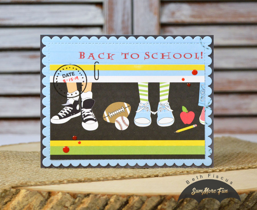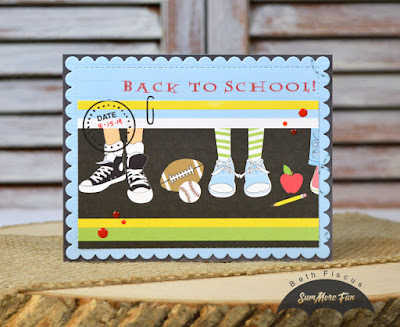 This card was pretty quick to make, using DCWV's Grade School stack as the focal point (love those shoes!). I die cut the blue background layer with a scalloped rectangle die and stamped the Back to School stamp in red. After adhering the shoe layer of paper, I used black in to stamp the date and paperclip from the Highly Confidential stamp set. A few dots of red Pearl Pen and it was complete!