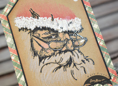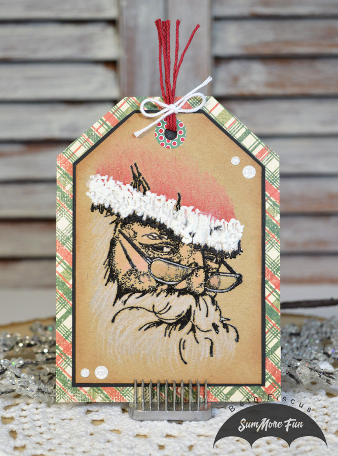 I stamped the face using Versafine Onyx Black ink onto a kraft tag that I hand-cut, then embossed with clear embossing powder. I then used Prismacolor Scholar colored pencils to color the image. I added Liquid Applique to the hat to make it look fuzzy and Glossy Accents to the glasses to make them look real!