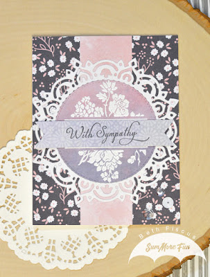 I stamped the floral stamp with VersaMark and embossed it with white powder. For the sentiment, I used Memento Tuxedo Black ink. I used the Kaisercraft Mandala die to frame the stamped area. It was a perfect fit for the card! All patterned papers are from DCWV's Peri & Peach stack. To embellish, I added some sequins in the bottom right corner. Adhesives used include ATG, Lineco Adhesive, and foam tape.