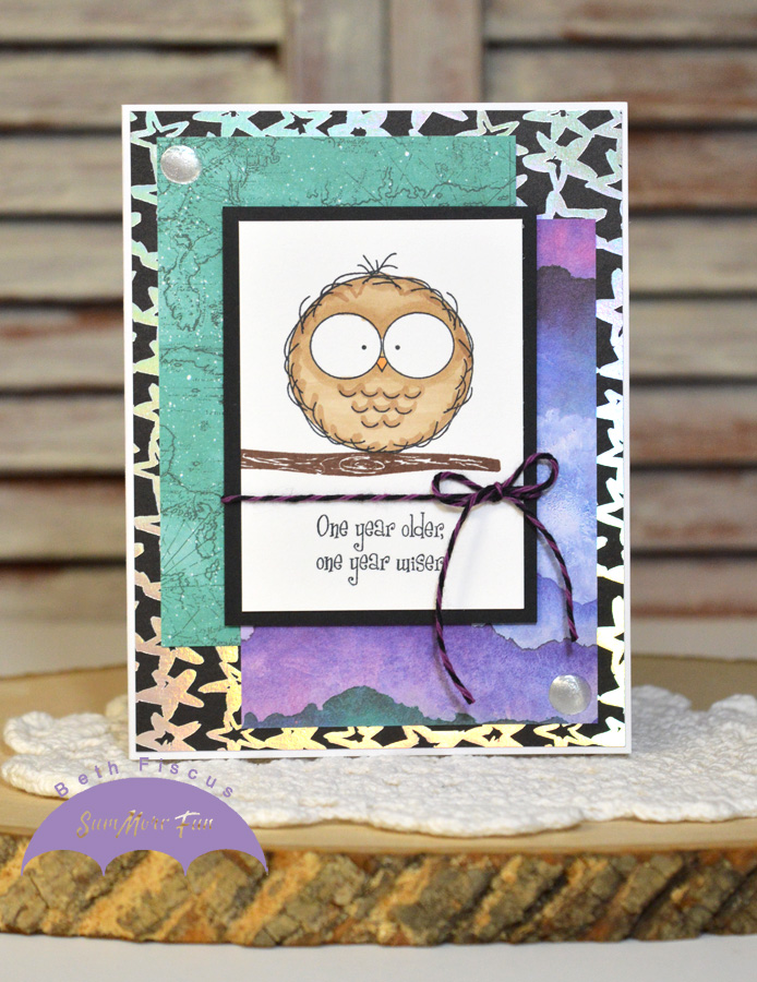I stamped the large owl, tree branch, and sentiment from the Night Owl stamp set using Memento Tuxedo Black and Rich Cocoa inks. I colored the owl with Spectrum Noir Markers (MB1, MB3, GY3) then wrapped Grape Licorice Trendy Twine around the stamped panel. I popped that up with foam tape.