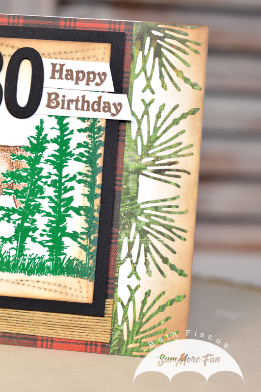 I created the focal point panel by stamping the Grove of Trees stamp on the left in green and the Moose stamp in brown and colored that in with colored pencils. I stamped a second Grove of Trees stamp on scrap paper and cut it out with by Brother Scan N Cut 2 to place over the back part of the moose. That panel was cut out with a wonky stitched rectangle die, then inked around with Walnut Stain Distress Oxide ink. I die cut and layered 3 of the black 80's and added the sentiment from the All Occasion stamp set coming from behind the 0.
