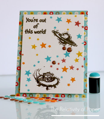 Hi, everyone and welcome. Lisa from The Relativity of Paper and it's my day to showcase a few Victorine Originals Stamps. I have to tell y'all I'm in love with the Saturn and Aliens In Spaceship stamps. I love the very whimsical feel and they're not too big making them a perfect pair along with the sentiment, You're Out Of This World.