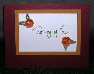 Then all you do is glue it onto your project! With my card, I stamped 74674-A Leaves, and cut the point of the leaves with my exacto knife, then I curled them up a little to give them life. Then I stamped my saying, 2832-D Thinking Of You.