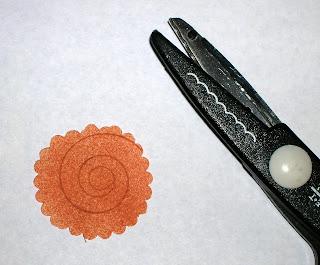 Next you will want to cut the circle out. I like using a scalloped scissor, but you can use any design. The smaller the design, the better. The flowers look a little different depending on which scissor you use, so you might want to play around with them.