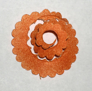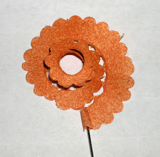 The first step is to stamp the Quilling Rose stamp on your paper. (I don't use card stock, it's too thick.) I stamped mine with the color Mango from Memories, then I sponged over it with the same color. If you want, you can just use colored paper. I probably would have done that, but all I had was pastel colored paper, and it didn't go with my color scheme, so I sponged the color I wanted. I did sponge on the back as well.