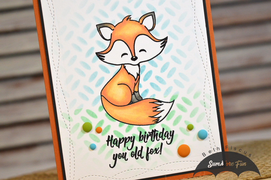 First of all, I stamped the awesome tractor stamp from the Raisin Boat Homegrown set with VersaFine Onyx Black ink. Once that was dry, I used watercolor pencils and a water brush to add the color. The panel was die cut with a GMD stitched rectangle die, then matted with a black rectangle die cut with a GMD wonky stitched rectangle die. The panel was popped up with foam tape onto the card base.